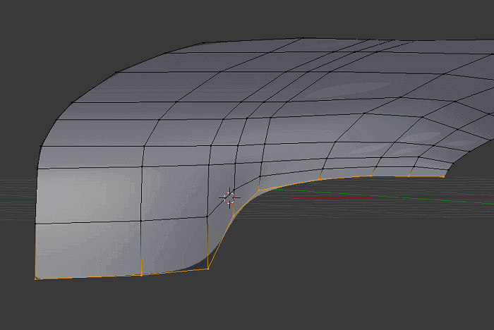 Z tym problemem pomoże nam, a jakże, nasze uwielbiane narzędzie – Loop Cut and Slide. Wystarczy wykonać cięcie maksymalnie przy zaokrąglonej krawędzi, tak jak na zrzucie ekranu poniżej.